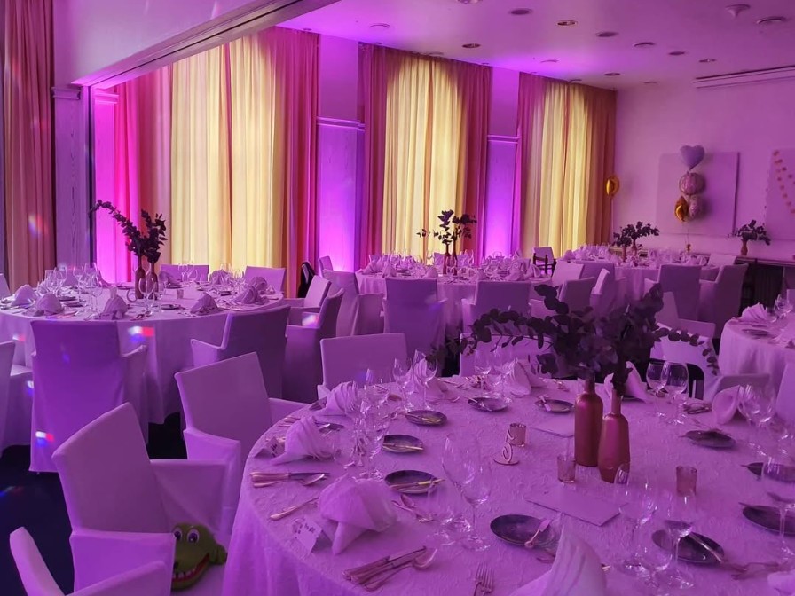 Selbst einfache Räume werden mit professioneller Beleuchtung in traumhafte Hochzeitskulissen verwandelt. Vom romantischen, warmen Licht während des Dinners bis hin zu farbigen Akzenten auf der Tanzfläche – die passende Beleuchtung sorgt für die richtige Stimmung in jedem Moment.